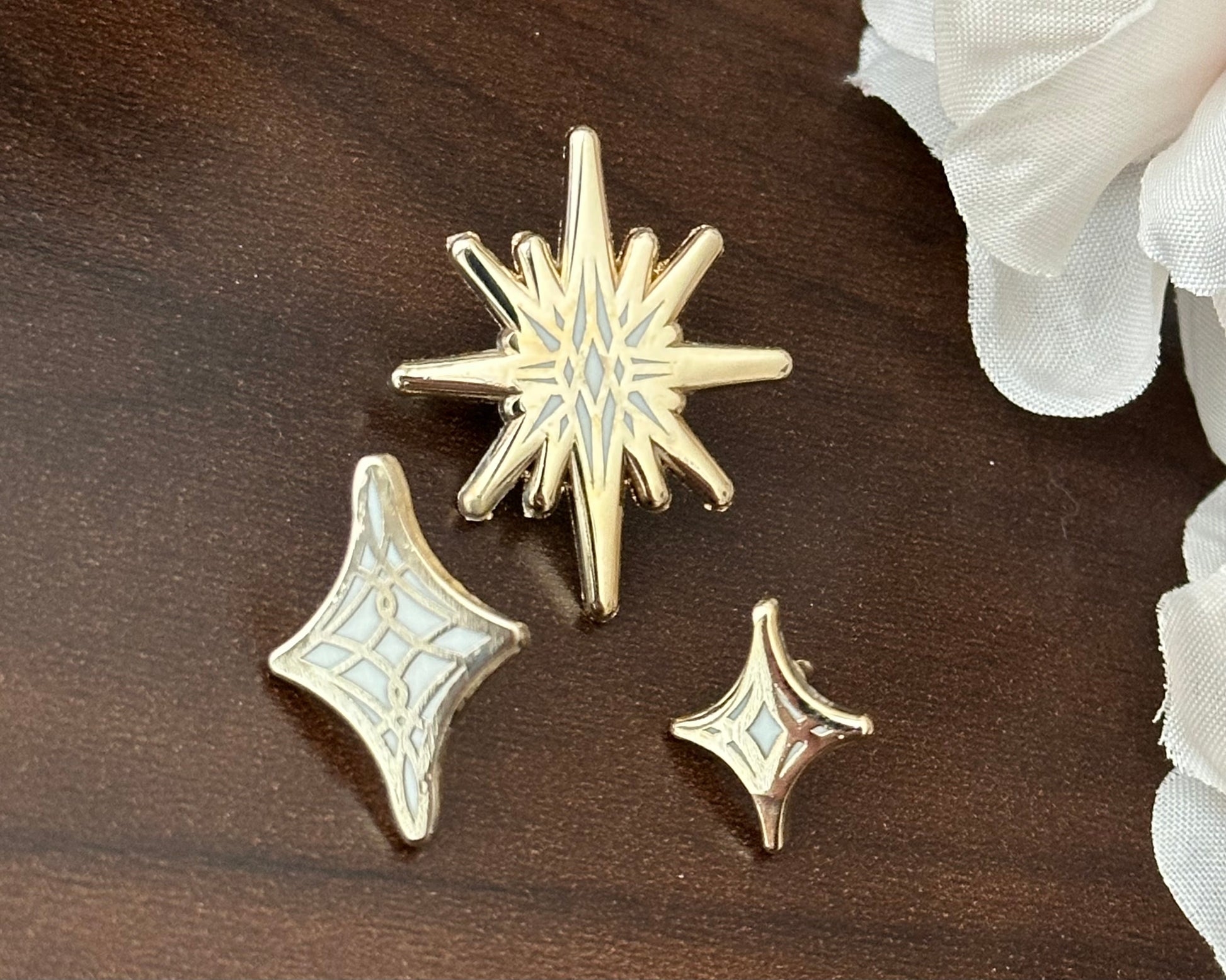This OOPSIE set of mini pins is from the initial production of the Celestial Garden enamel pin collection. The posts on the back were placed too high on the small stars, causing them to be visible from the front in some cases. There were also a lot of minor flaws, resulting in the mini pins being remade with another manufacturer.