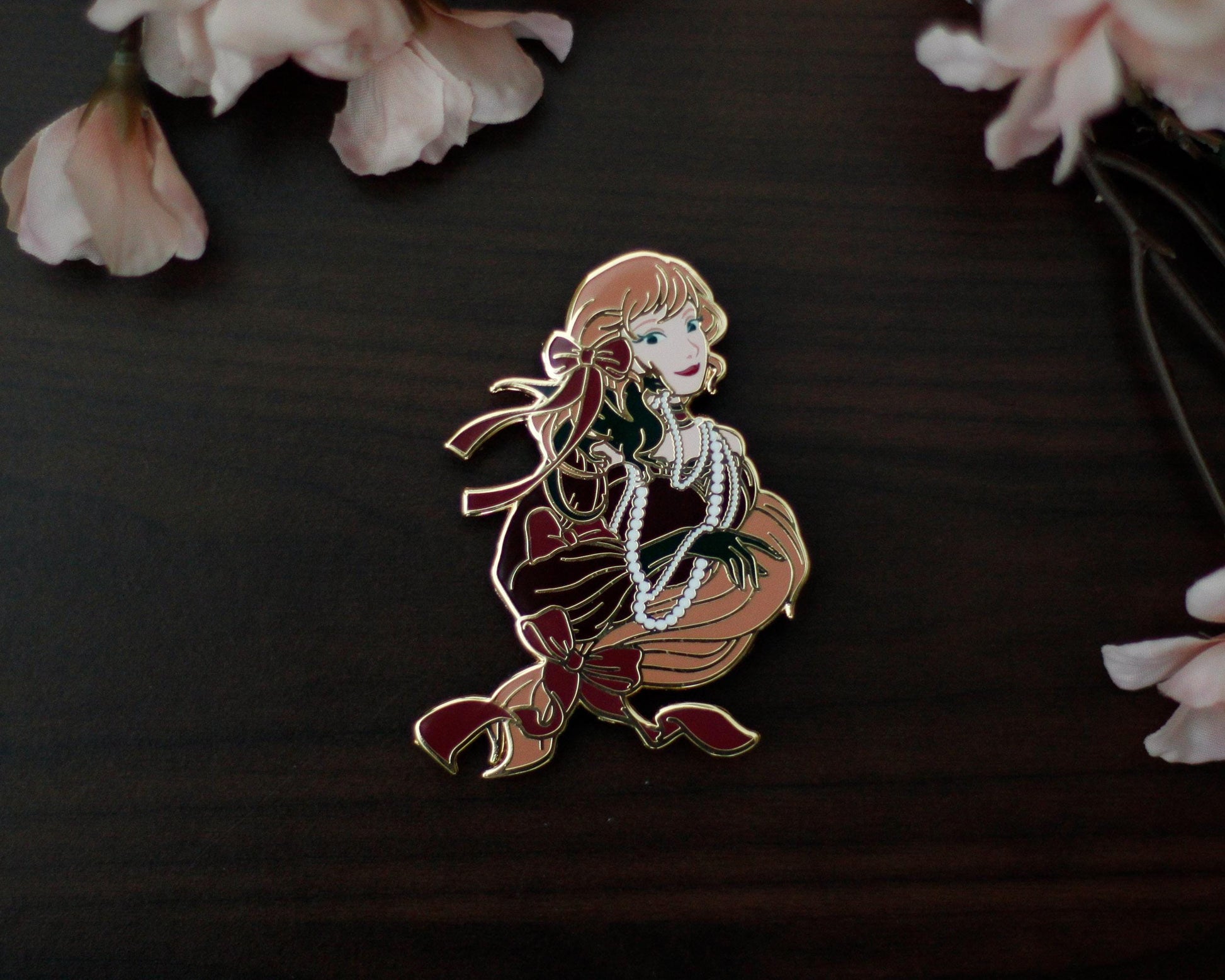 Attending the Midnight Soiree is more fun with a Shoulder Friend! This large enamel pin depicts a fancy lady and her tiny dragon companion in the Festive color variation featuring dark green and red hues.